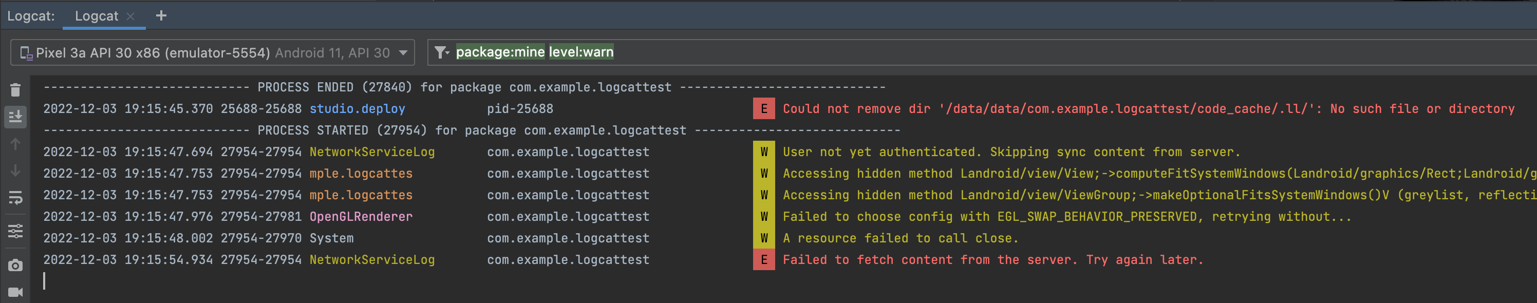 package:mine level:warnSimple enough. However, without the drop-down in the earlier versions of Android Studio, it is often easy to forget the levels. The levels that Logcat supports are verbose, debug, info, warn, error and assert. I appreciate the changes made to the UI that makes it easier to recognize each level.