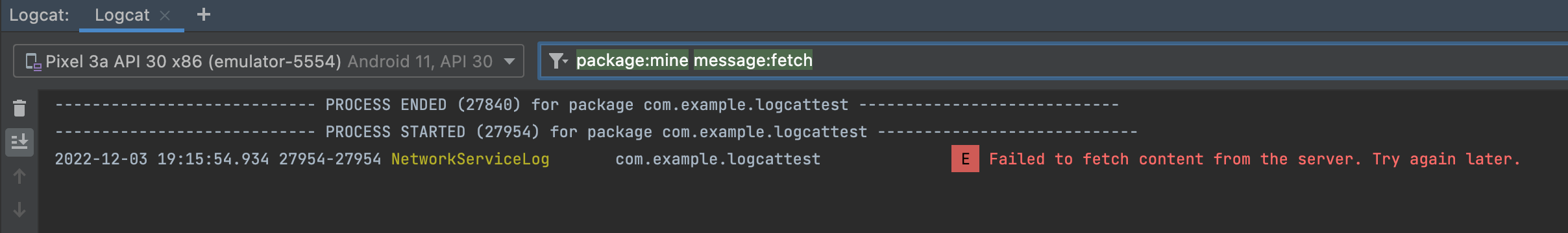 package:mineThis is a basic query that is easy to forget if you are coming from an older version of Android Studio. Adding this to your query will gather logs from your app’s package only. I’ll keep using this parameter for the remainder of my examples to limit my search and construct queries that I can copy/paste right into my IDE.