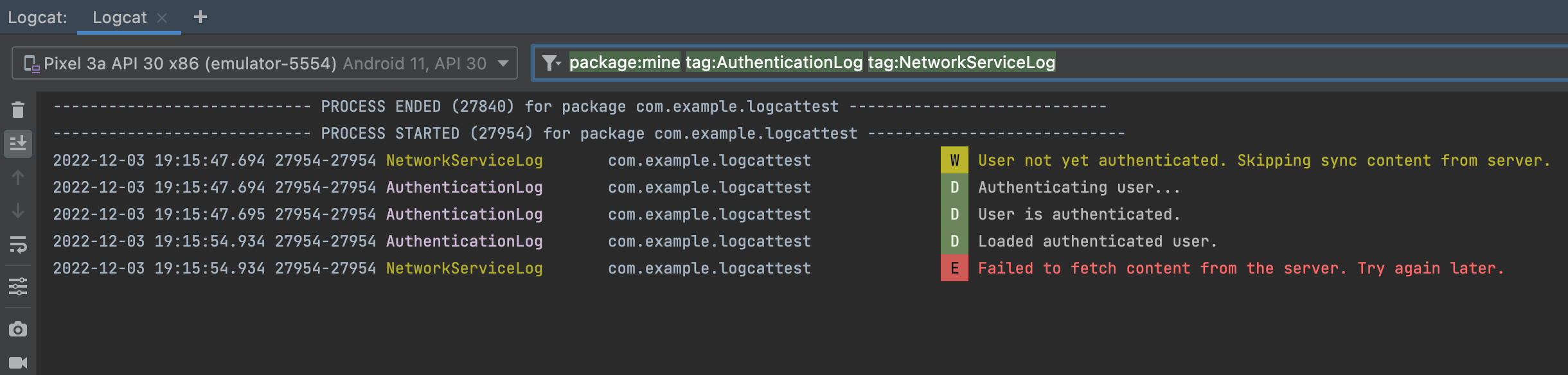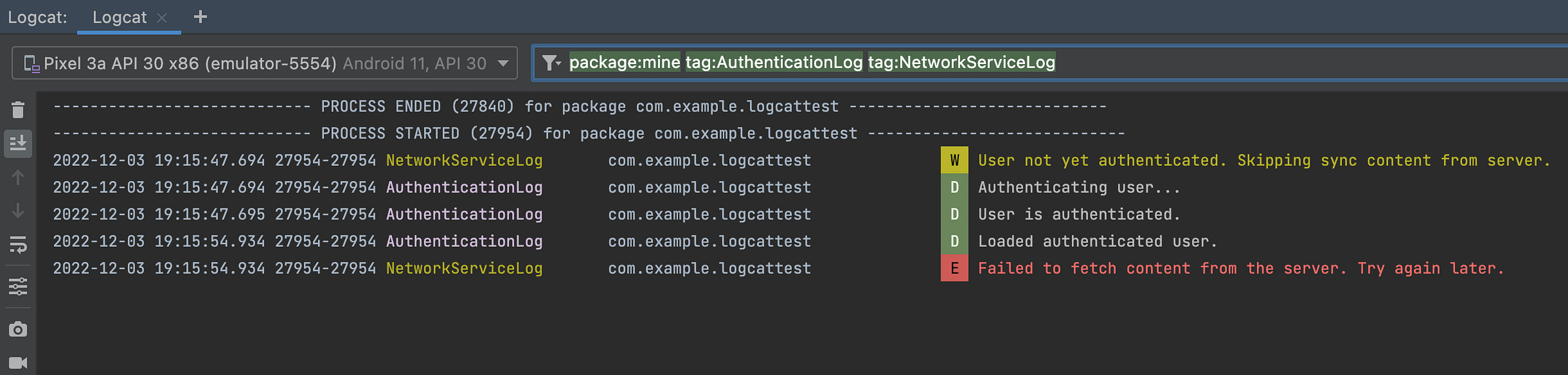 package:mine tag:LifecycleLogThis is one of my favorite features. The key-value queries now allow us to get more out of Logcat. In this case, I can easily target a particular tag to pinpoint an issue. In the example below, I can also target multiple tags to get a better idea of an overall feature. I see logs as a trail of a user’s journey and being able to separate the logs to it’s own functionality can better paint a picture of where the issue actually lies (UI, business logic or backend services).